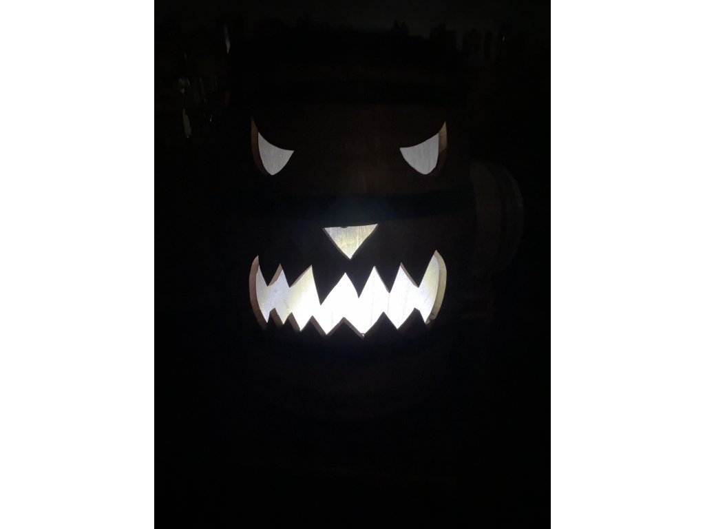 Originální halloweenský sud ze starého dubového barrique, vyřezaný do strašidelného motivu. Stylová dekorace, která dodá každému prostoru jedinečnou atmosféru.